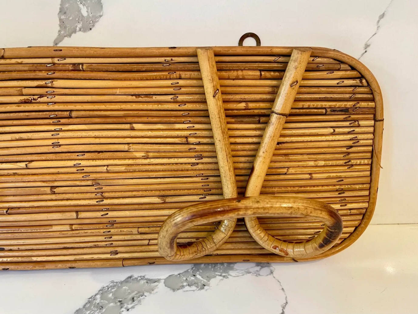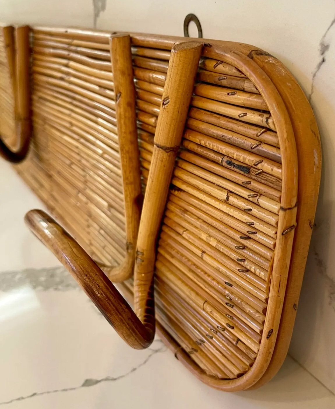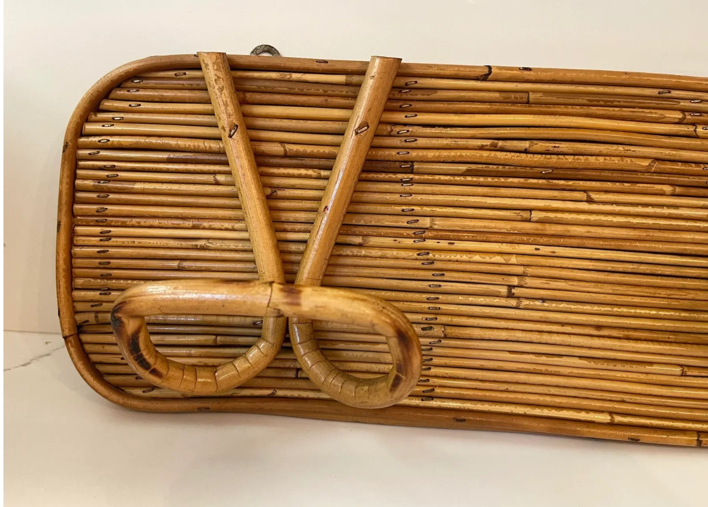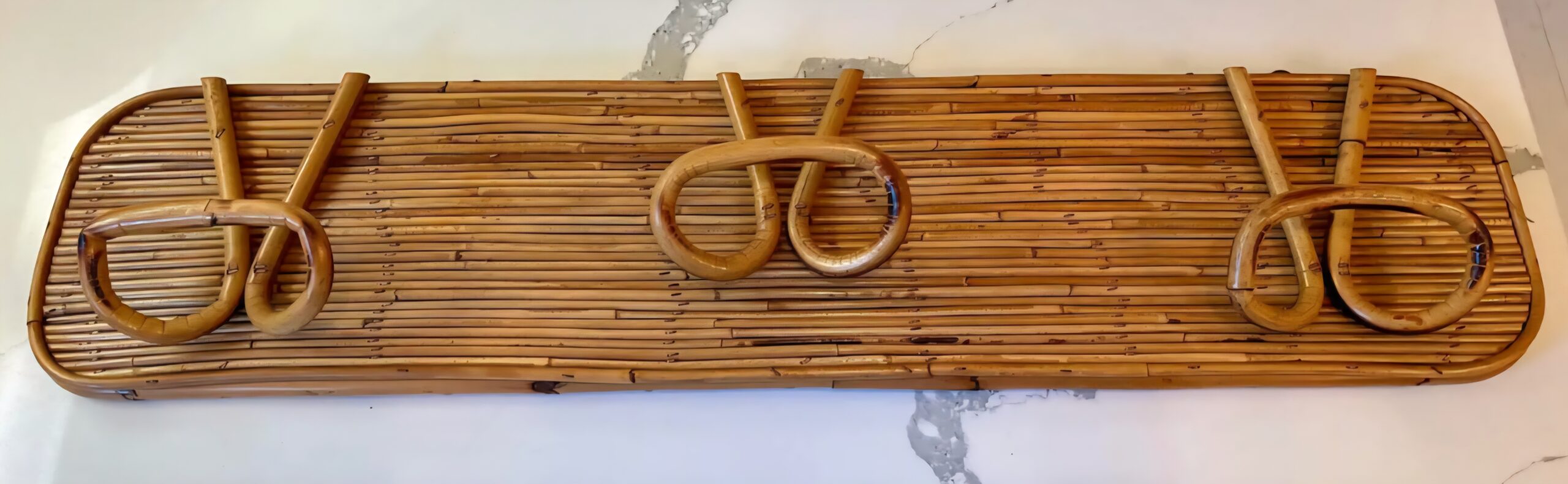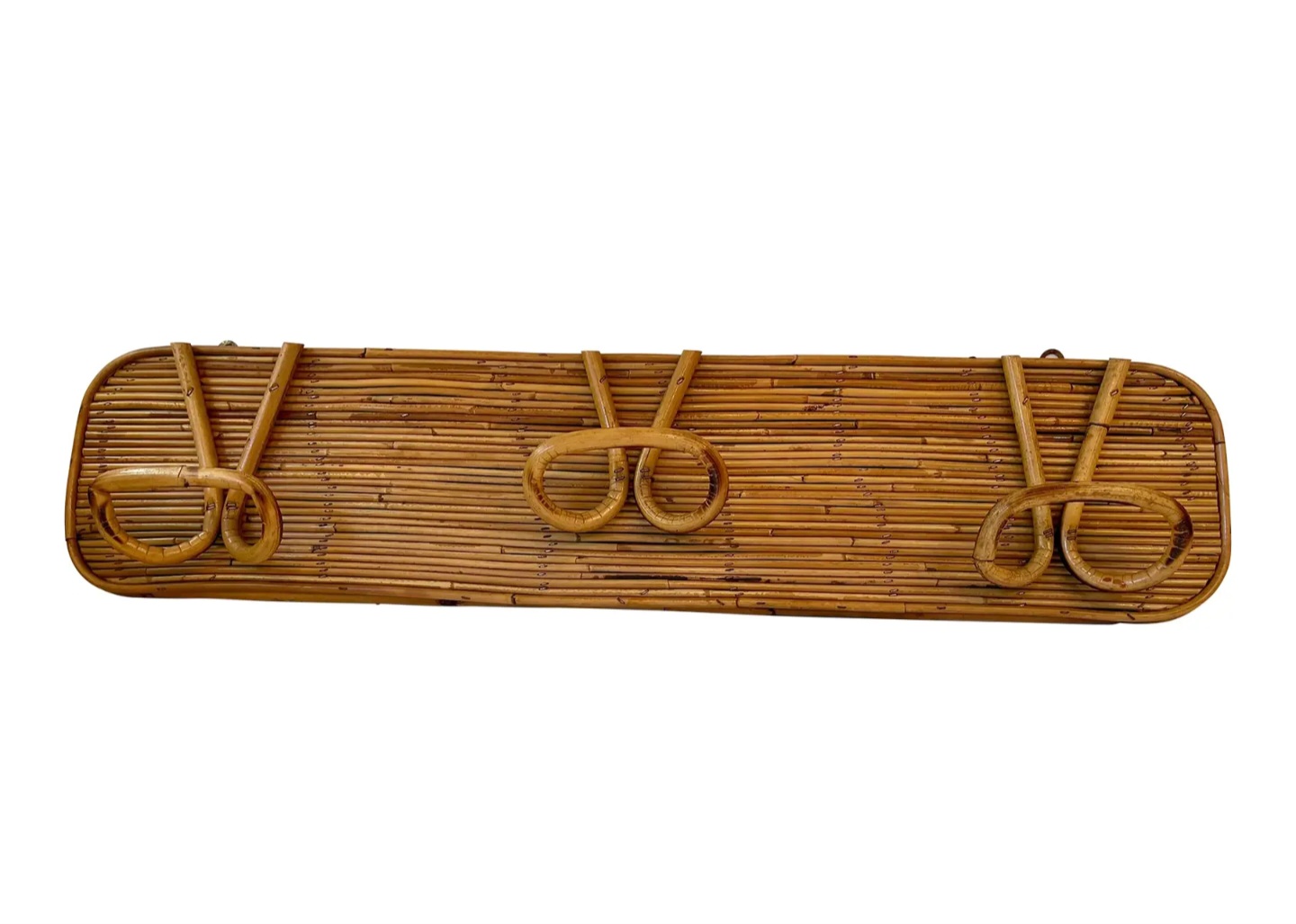 In the style of Gabriella Crespi, this 1950s Italian reed and bamboo wall-mounted coat rack showcases elegant craftsmanship and natural materials.