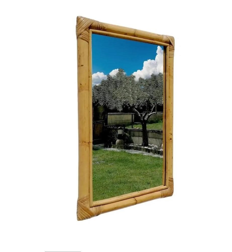 This large 1960’s Bonacina-style rectangular wall mirror features a handwoven rattan frame with clean, linear detailing characteristic of mid-century Italian design. Its warm, natural texture adds organic elegance, while the substantial size makes it a striking focal point—perfect for adding light and depth to any space.